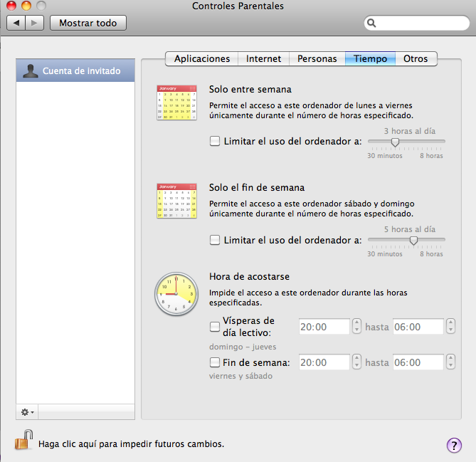 Aunque esta cuenta tiene sus limitaciones, si aún queremos limitar mas su capacidad, podemos volver a las propiedades de la cuenta «Invitado» y activar los «Controles parentales». Esto nos ofrecerá un mundo de limitaciones muy variado, ya sea en horarios, restricciones en la navegación, ejecución de programas, acceso a dispositivos externos, etc.