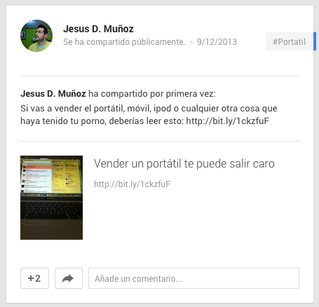 En Google+, el sistema es similar. Automáticamente, cuando compartimos un enlace, la red social de Google elige esta imagen destacada (podemos usar varias y elegir) o bien la primera imagen que encuentra en la entrada del blog.