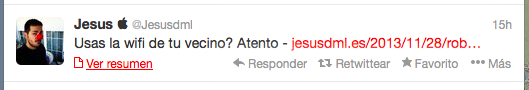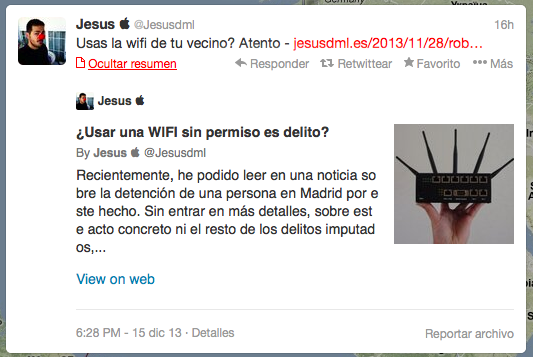 El resultado del mismo tuit con Twitter Cards, es visiblemente mejor. Por ejemplo, comparado con el twitt anterior de esta misma web, usando Twitter Cards: