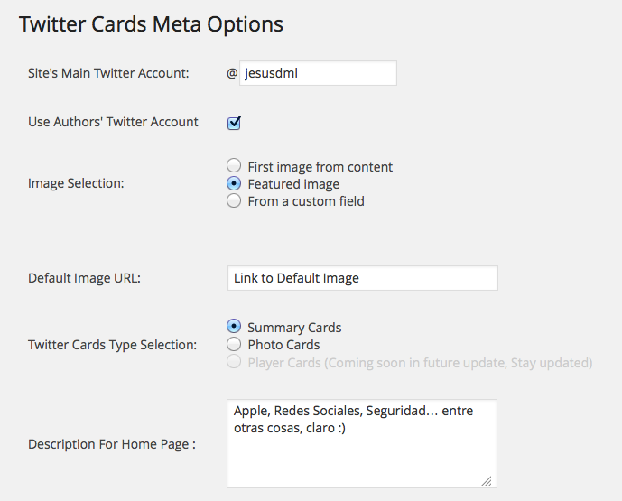 La implementación de Twitter Cards es muy sencilla. Lo primero que debes hacer es instalar un plugin, que te ayuda a configurar de una forma sencilla Twitter Cards. He probado varios y el que me resulta mas cómodo es Twitter Cards Meta. Este plugin nos agregará las cabeceras necesarias para que, cuando cualquier usuario añada un enlace a nuestra web en un twitt, tengamos un resumen adjunto sin consumir ningún carácter extra: